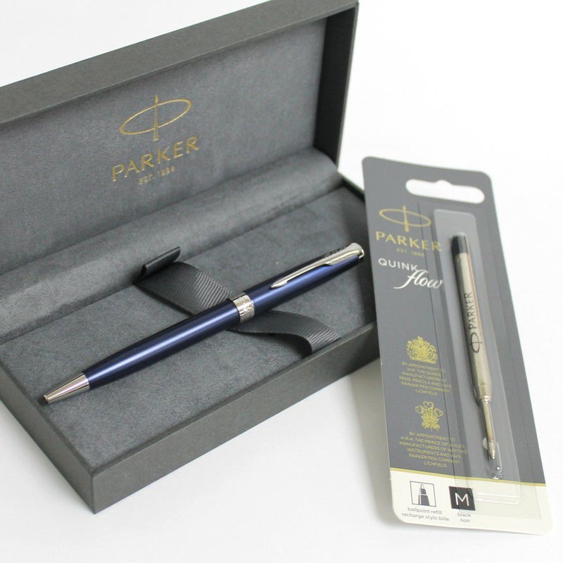 深みのあるブルーが印象的な、パーカーソネットボールペンブルーCTと、パーカー純正黒中字替え芯1本のセットです。