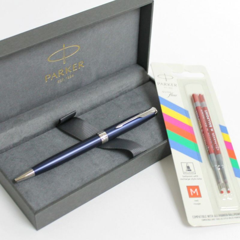 深みのあるブルーが印象的な、パーカーソネットボールペンブルーCTと、パーカー純正赤中字替え芯2本のセットです。