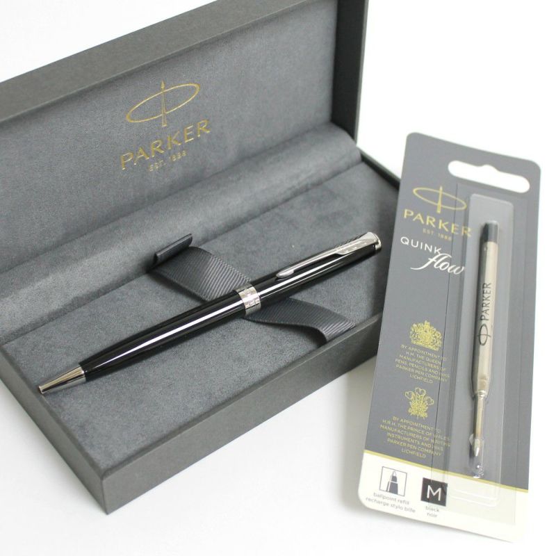 ラッカー仕上げの艶感とさわやかなクロームトリム。パーカーソネットボールペンラックブラックCTと、パーカー純正黒中字替え芯1本のセットです。
