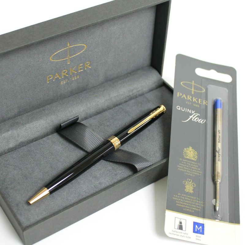 ラッカー仕上げ&ゴールドトリムで抜群の高級感。パーカーソネットボールペンラックブラックGTと、パーカー純正青中字替え芯1本のセットです。