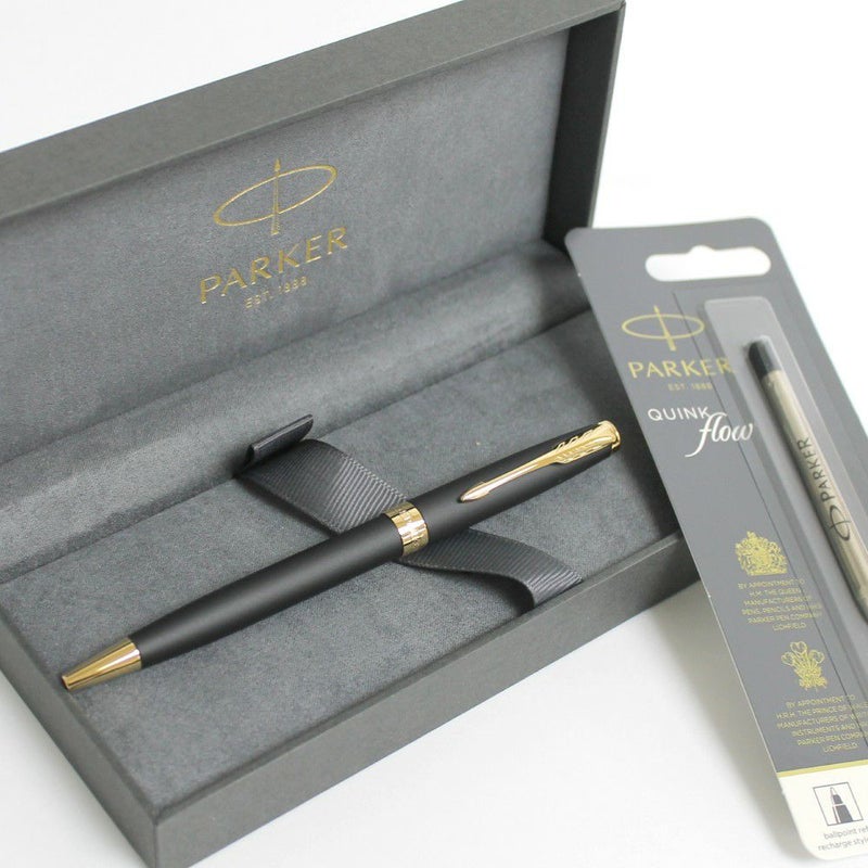 艶消しのボディとゴールドトリムが上品。パーカーソネットボールペンマットブラックGTと、パーカー純正黒中字替え芯1本のセットです。