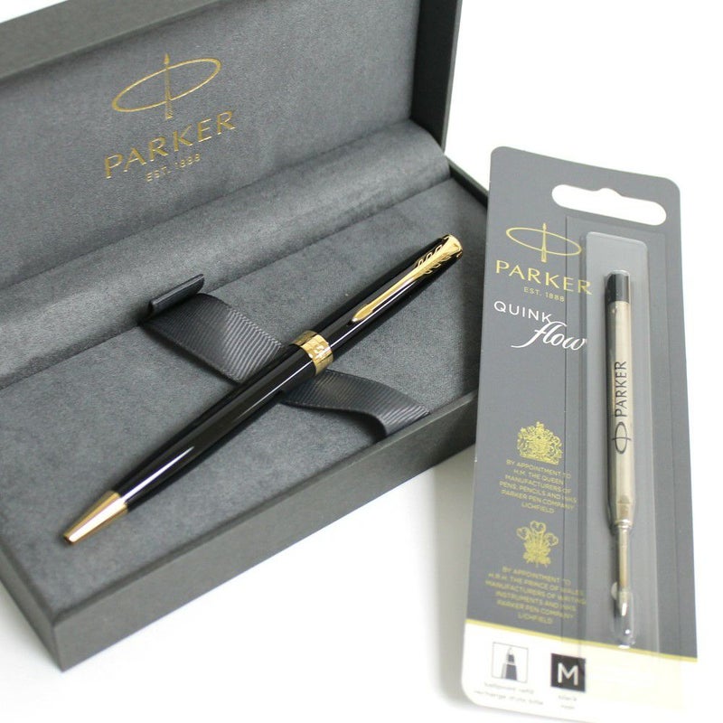ラッカー仕上げ&ゴールドトリムで抜群の高級感。パーカーソネットボールペンラックブラックGTと、パーカー純正黒中字替え芯1本のセットです。