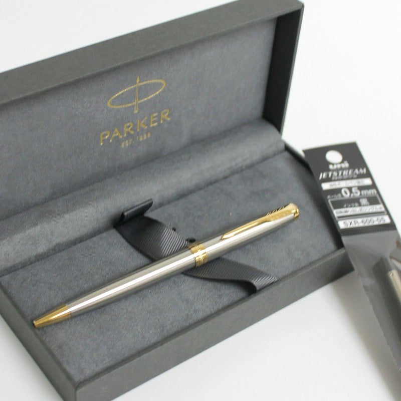 幅広い年代から指示されるシルバーとゴールドの魅力。パーカーソネットボールペンステンレススチールGTと、ジェットストリームSXR-600 0.5替え芯1本のセットです。
