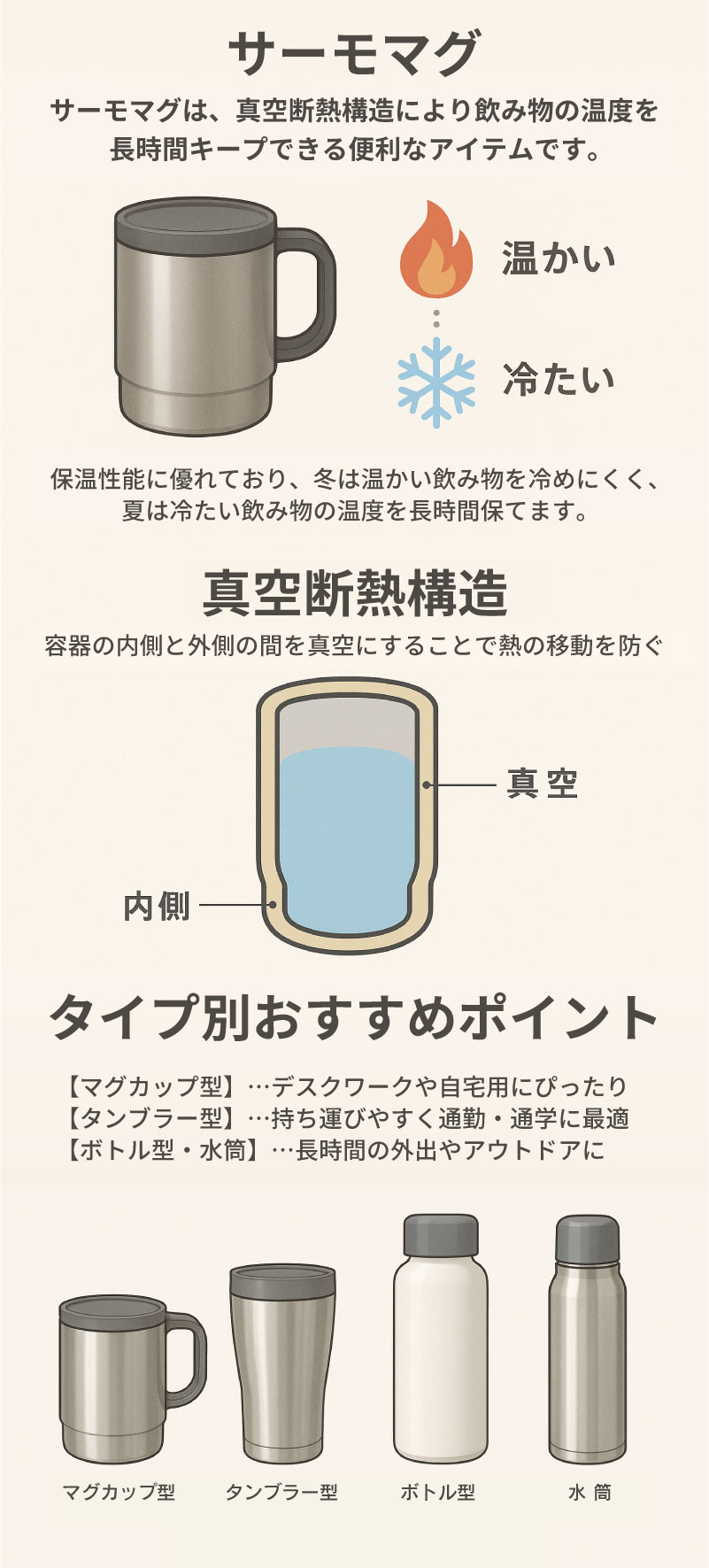 サーモマグは、真空断熱構造により飲み物の温度を長時間キープできる便利なアイテムです。