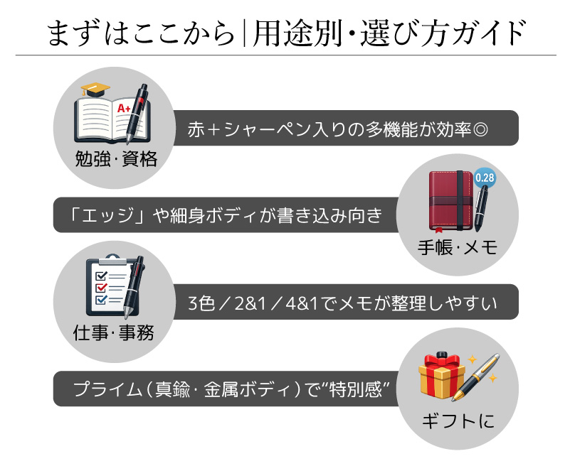 滑りにくいグリップ系を中心に、“すぐ書ける”ボールペンがおすすめです。