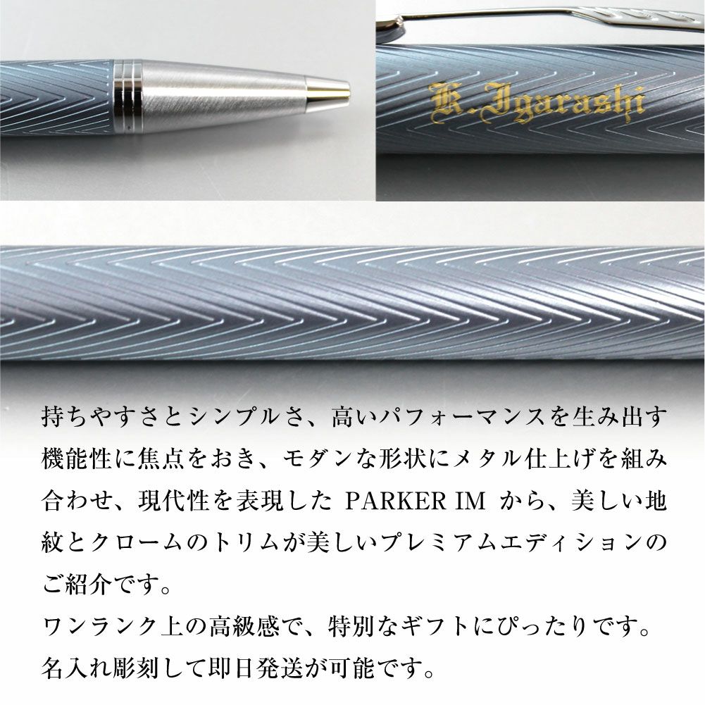 他の画像を見る ワンランク上の高級感。プレミアムな輝き パーカー IM プレミアム ボールペン ブルーグレイCT 即納対応 名入れ彫刻 彫刻シミュレーション 送料無料 特別価格 ¥ 8,800 税込 詳細を見る お気に入りに登録する